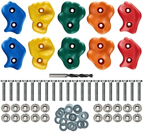 === > Your Pro-Hold Rock Climbing Holds Set: Higher Quality, Easiest to Install < === Easiest to Install: Other rock climbing holds come with T-nuts that are hard to install in standard 1″ decking. This rock climbing kit provides long-barreled weld nuts for hassle-free installation. You get 10 colorful climbing rocks, all made of super-strong molded plastic for many years of use. Mount them on a playset or use them to build your own backyard climbing wall. Safer for Your Family: Unlike some rock climbing toys, ours are ASTM- and CPSIA-compliant, which means they contain no lead or heavy metals. They’re also UV-stable… won’t fade, weather, or crack. More Hardware: Along with our unique, longer weld nuts, we provide 20 bolts, washers & lock washers… plus a custom drill bit for drilling perfectly sized holes in lumber from 3/4″ to 1.25″ thick. No Rusting: Ordinary hardware easily corrodes in contact with treated lumber. But your Pro-Hold kit’s hardware is Dacromet(R)-coated to resist corrosion, so your climbing stones will stay firmly attached.
