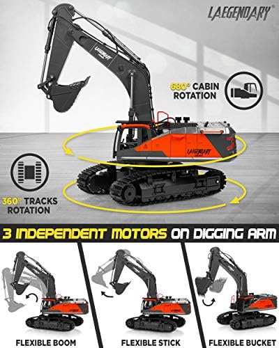 LAEGENDARY waves any responsibility for the misuse and inadequate installation of any products sold or distributed through it or any affiliate. The user assumes responsibility for any injuries received due to user misuse, mishandling or the improper installation of the product and waives any responsibilities of LAEGENDARY disclaims all warranties, expressed or implied, including, but not limited to, implied warranties of merchantability, title, and fitness for a particular purpose or other proprietary rights. LAEGENDARY will not be held liable for any damages resulting from the use of this product. More Fun with Extended Run Time: Equipped with two Li-Ion 7.4V 1200mAh rechargeable batteries, the Laegendary Digger will run for 90+ minutes at a time and you can run up to 20 vehicles without interference – Don’t stop the fun with this great gift for anyone who loves construction toys Improved Speed and Performance: The large premium RC dozer has 3 independent motors controlling the bucket, the elbow part along with primary arm separately. The cabin rotates 680 degrees so you can dig in any direction. If you are a hobby enthusiast or a heavy equipment operator you will truly appreciate the detail and quality of this radio controlled trackhoe Experience the Real Digging: The 22CH 2.4GHZ Radio System with multi-function controls will put every part of the construction vehicle under your command. Sand and rocks are no problem for the Digger semi tractor. It is made to dig, lift, and carry! Transform your own backyard into your very own Construction Site Backhoe loaders are great for making the transition from RC cars to RC construction. Both kids and adults can have an awesome experience operating small scale machinery that normally requires years of training to master in the real world. You can use the Digger indoors or outdoors and it works great with our bulldozer, dump truck and front loader Ready for Adventures: The heavy-duty excavator is Ready to Run out of the box. It comes with the realistic features a true caterpillar construction automobile has, controllable cabin lights and sound, a metallic claw for digging hard sand or soil. RC Excavators make a great gift for construction lovers of all ages