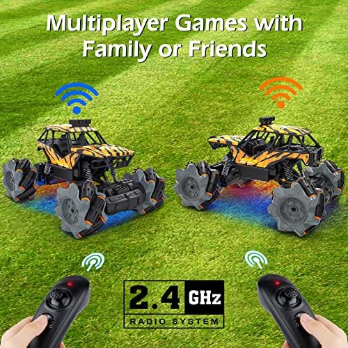 【RC Cars with Special Wheels 360° Rotation and 45° Sideways Drift】: Different from other rc cars, this 1/18 scale remote control car has 4 Special Wheels for monster RC trucks enthusiast. The Special Wheel can make it 360° Rotation and 45° Sideways Drift, climb over objects indoor/outdoor easily. It is equipped with unique roller-traction tires, can tackles all terrain. Rear drive engine revolution speed up to 8500 revs per minute which allows the toy car to reach the speed up to 15-20KM/H. 【2 Rechargeable Batteries for Enough Family Time】: The 3.7V/500mAh capacity rechargeable battery only takes 2 hours to fully charge (30 mins for each battery) and USB charging line give great convenience for the rc cars charging. You can have at least one hour family time with your children. Best 5 6 7 8 9 10 11 12 Boy Gifts. 【2.4Ghz and Non-Interference with One-Handed Control】: 2.4 GHz remote control system offer a stable signal and it has a non-jamming function which can control range about 131ft(40m). Kids will enjoy more fun with family or friends from this rc trucks. One-Handed Control is very easy, allow children which is from 6+ can play it well. 【Tested Anti-crash & Anti-slip Driving】: The all-terrain vehicle is made of sturdy and non-toxic ABS material, have smooth edges. The strong shockproof and elastic rubber tires support the interior of the rc car having a good shock absorption performance, which can fully reduce the impact caused by rapid descent even from 1 meter, so as to achieve the effect of smooth landing. It help the rc cars play well in all types of terrain, grassland, sand beach, rock or stairs. 【High-quality Rc Car Toy Gifts for Kids】: Equipped with colorful LED lights(play at night will be more fun), strong alloy shell and exclusive stunt drift tires which support 360° rotation, this rc truck car is one of best gifts choice for your family. Package Content: 1*RC Car, 1*Remote Controller, 1*Screwdriver, 2*Car Batteries, 1*Car Battery Charger, 2*Controller Batteries.