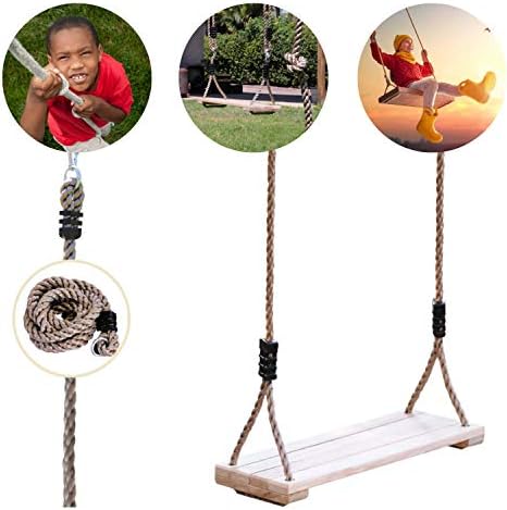 In order to prevent weather damage to the natural wood swing board , it is advised to coat the wood with varnish before use and store it in a dry place during the winter season or when not in use for a long period of time . Go ahead and enjoy a swing set that gives you double the value ! Let your kids be kids , get them away from the screen by giving them a fun outdoor time with a play set that includes a wooden swing and a 9.8ft climbing rope for double the value No graze perfect activity for all , with our smoothed natural high quality rope and the ability to carry 265Ibs very sturdy so that everyone in the family will have a blast Easy installation , we added exactly what you need in order to be able to quickly install the swing and climbing rope right when you get it . The designed gift box includes 3 buckles and 3 straps to hang in the backyard or porch on a beam or a tree branch Perfect gift for all ages , especially during these times when we want to keep ourselves and the kids active we believe our 2 in 1 box swing and climbing rope is the ideal gift and so we designed the gift box it can be given as present Maya’z Choice is a boutique family business established from our need for solutions to our little family hoping to assist others through our experience . We manufacture only high quality and safe products that gives us activity solutions and lots of family fun hours