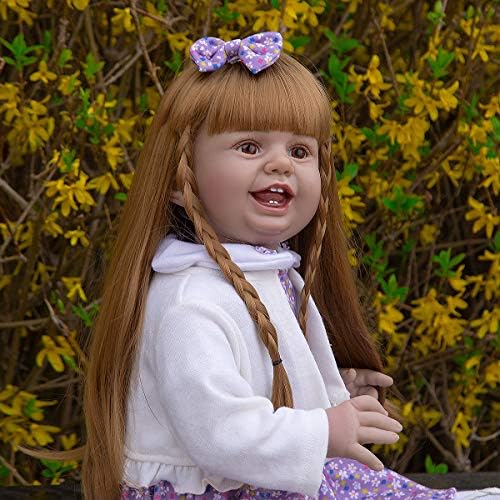 【Big Size Doll】-Baby HAPPY is approx 27 Inch/68cm in length, it’s bigger than a normal one. Weighted cloth body approx 1.95kg/4.3Ib after packaging. The limbs are moveable, she can sit and lie. No matter if you are collecting it or giving it away, make you have many faces. 【Beautiful Appearance】-The baby has a smiling face, whenever you see her, she smiles at you, and you will be very happy when you see her. When you see her happy smile, you will forget all your troubles, forget all the unhappiness, forget The fatigue of your day, only leave comfort and peace of mind. 【Realistic Detail】-Prepare to be blown away by this baby doll’s realistic details. Baby HAPPY has charming big Acrylic eyes, they look like a real baby’s eyes, clear and bright, extremely realistic. Soft long light brown hair, DIY hair style, you can make hair style for her as you want; Hand-painted Eyebrow , eyelashes, lips and the fingernails, all details make the baby just like a real baby, you cannot help but love her. 【Doll and Accessories】-She comes in a nice gift box and full set of accessories for taking care of a newborn. Pure handmade Purple floral skirt with White knitted cardigan sets; Matching card issuance; One pair of white canvas shoes; Magnetic Pacifier; Feeding bottle and Birth Certificate.Also you can change the clothes for you, newborn 0-3 month(59cm) clothes suit her. 【Safety Material】-Adopting Environmentally Friendly non-toxic material conforms to the safety requirements of ASTM F963 and EN71 for ages 3+ kids; We are committed to providing children with safe, interesting and realistic toys for infants and young children, so that children have new discoveries every day, so that children’s childhood has a happy partner.