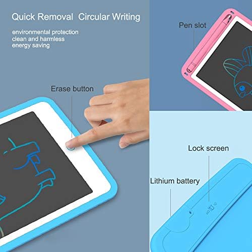 【10” & 8.5” Combination LCD Writing Tablet for Kids】2 Pack (10” Blue and 8.5” Pink) drawing LCD writing tablet is ideal gifts for boys and girls. 2pack suitable for one or more kids painting, graffiti, writing, learning, draw a chart, and so on; or used for different scenes like school and home, also suitable for adult to take notes, leave message at home or office. 【Clear and Bright Colorful Line】Afoskce colorful screen writing drawing doodle board uses the latest LCD pressure-sensitive technology and relies on pressure sensing to display text. You can create lines with different thickness according to the strength, just like using pen and paper. 【Eye-protecting & Environmental-Friendly】LCD screen, no radiation, no glare, can protect children’s eyes. They can draw and write on the colorful doodle board, play for hours without feeling tired. Let them play as much as possible and stay safe, and you don’t need worry about graffiti on the wall at home. 【Easy To Use with Erase Key & Screen Lock】Afoskce LCD drawing pad can erase screen with one click, and also could screen lock to prevents accidental clearing. It support more than 50,000 times write, and cleared without a trace. These portable scribbler boards built-in replaceable battery lasts 12 months.Note: After pressing the erase button to clear the screen, it is normal for the micro-current to clear the handwriting to appear flashing on the screen. After 1s you can write again. 【Toys for 3-14 Years Old Kids】Let children express their inner thoughts by painting and writing. Inspire your child’s creativity and show their interesting imagination to you. It is an early childhood education toy and the best gifts toys for Christmas, Children’s Day, birthday, Thanksgiving Day, Easter and any occasion. You can get 1 x 10inch blue LCD writing table with pen, 1 x 8.5inch pink LCD writing table with pen, 2 x replacement button battery, 1 x English user manul.