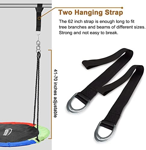 [Swing with Safety]-Large 43” heavy duty steel frame with seam-sealed Textilene fabric can fit 2-3 kids or 1-2 adults. Thick gavalnized steel tube with padding has anti-rust and weather-resistant features and provides comfort and safety. Strong stainless hardware, quality black nylon strap and multiple strands braided 12mm thick ropes ensure children’s security. Reinforced M11 carabiners are of better quality than M8 or M9 ones. Hold up to 700 lbs in a static state and 300 lbs in motion. [Textilene Fabric]-Compared with Oxford fabric surface, Our round swing seat is made of Textilene fabric which has longer life with anti-aging, tear-resistant, waterproof and corrosion resistant performance and is breathable. Its anti-UV function can maintain the bright color of the sitting mat without fading for years. Textilene fabric swing seat with smooth touch provides you with quality experience. We built the swing seat to be oil-resistant and easy to clean. [Easy Installation]-Detailed instruction included is easy to follow. With complete hardware and parts, you could easily install the circular saucer swing and take apart it for winter in minutes. Detachable swing is easy to store in car trunk and carry for outdoor use. Unlike other swings, we use a plastic part to connect hanging rope and swing seat. Compared with combination of bolts and nuts, plastic connector won’t rust, come loose and fall out. [Customize Your Play]-With 2 hanging straps and 2 galvanized climbing carabiners, you can hang swing with one point for 360°rotation or hang swing with two points for flying back and forth. With 41”-70” length adjustable ropes, you could hang swing to low places for gentle and safe swing or hang to higher places for exciting fun and adventure. The swing can be hung from a tree or swing set. Great for backyard, playground, garden and playroom. [Perfect Gift for Kids]-Flying saucer swing is a fun and beneficial outdoor activity for kids. Kids can sit, lie and read books on the swing to enjoy fun play with friends and family, which will help children get away from TV, digital product and protect their eyesight. Good choice for children and family to enjoy unlimited outdoor fun and a relaxing time. A great Christmas or birthday gift for kids. [Complete Parts & After-sale Service]-1 round Textilene cloth, 4 metal tubes with padding, 2 ropes with plastic parts, 2 hanging straps, 2 carabiners, 1 M12 swivel hook, 1 black storage bag for small hardware and 1 manual. FREE replacement complete swing within 30 days and FREE replacement parts during lifetime with NO shipping charge. We will provide prepaid return label if you want to return. If you have any questions, please feel free to contact us. We will response within 24 hrs.