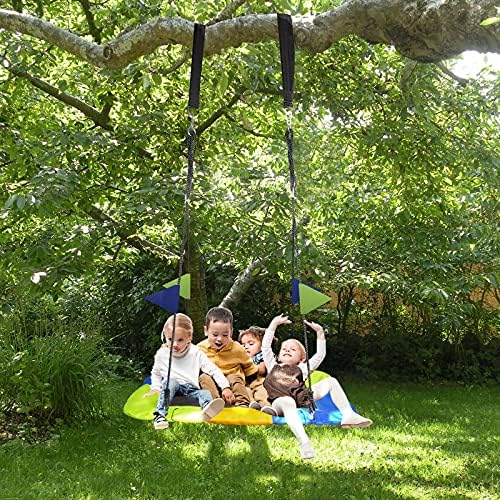 STURDY LARGE PLATFORM SWING: This platform swing with strong steel frame and durable textile fabric seat fits 4 kids or 2 adults. Can hold up tp 700 lbs. Safe for children to have fun. GREAT MATERIAL. Our large swing seat is water-resistant, wear-resistant, oil-resistant, ultraviolet-resistant & non-toxic. Just enjoy swing platform with your families for endless fun. FREE STRAPS & DURABLE ROPES: Our tree swing includes 2 pack 70-inch 2000lbs tree straps and 4 flags. No need to buy extra straps or other accessories. Extra Adjustable 71-inch long 12mm thick ropes are made from high quality PE webbing with metal rings for secured fastening. EASY TO ASSEMBLE: This platform tree swing comes with instructions, hardware and mounting gears. You can easily attach this swing seat to a tree as backyard swing or playground swing. FOR MANY OCCASIONS— Great for backyards, playgrounds, indoor play areas. Also a great choice as Halloween gift or Christmas gift. Can also be used as chair swing for tree, hammock swing, swing set, nest swing chair. Fun for kids, teens, and adults with friends and family. Perfect for parties and, holiday, family time.