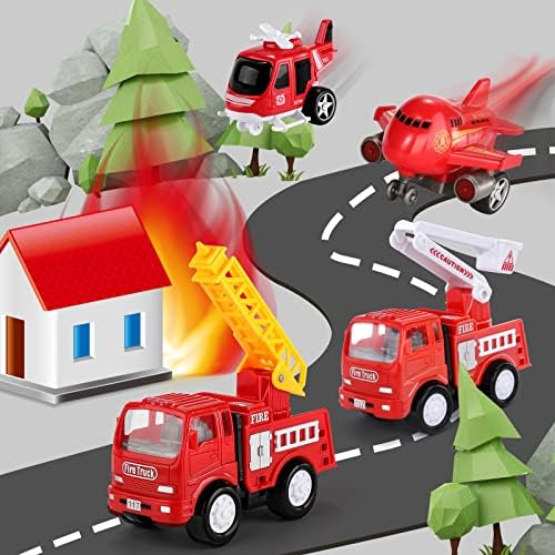 【COLORFUL CONSTRUCTION SET】 This Fire transport truck toy includes a larger transport truck and 4 mini fire lifting truck/ladder truck/helicopter/plane. Ideal toddler toys for age 2-4.The working parts of 4 small fire vehicles can be rotated and extended, which make your little hero feel an emergency rescue mission is being carried out more truly,drawings better arouse kid’s curiosity and make games time for toddler age 3-4. 【PULL BACK CARS TOY】Just push the big carrier toy truck forward, it will carry four mini toy vehicles and set off! Pull the car back, then release your hand, they will running forward by themselves. Easy to play toys for baby 18-24 months. 【PERFECT SIZE FOR TODDLERS】This toddler toy set adopts a scientific size design, which is more suitable for children’s small hands. The edges and tips are rounded so that children can play with toys safely. This toys car better takes children into the world of real fire scene. 4 mini cars are more suitable for kids aged 3-6. 【MULTIFUNCTIONAL BOY TOY CAR】 Press the button on the top of the cab, you can see the flashing lights and hear the realistic police siren, which will last for 8 seconds. You can separate the truck cab from the trailer, and then open the tailgate to unload the mini vehicle. The head of a large aircraft carrier can also be turned. 【AMAZING KIDS GIFT】 This is an educational fire rescue toys are package with beautifully designed gift box. As toys, Christmas gift, early education toys, preschool props, teaching aids and much more. A highly recommended birthday present, gift ideas for kids, home decoration, travel toys, party favors, festival gifts, Christmas gifts toys for 1 2 3 4 5 6 year old boys girls toddlers.