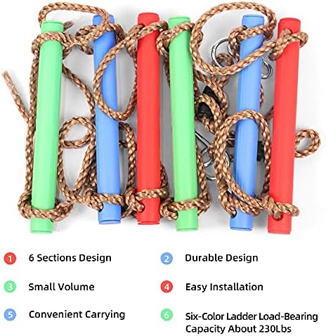 【Ladder Size】This rope ladder is 6.6ft in length and 12inch in width,which is the perfect size for child to climb and add challenge for the older kids.Your kids will love this climbing rope ladder. 【High Quality Materials】The hanging Ladder for Swing Set is made of high-quality plastic and strong polyester rope, which is durable, not easy to break. The surface of each step has dents to provide good grip, but the grip is comfortable and not slippery at all. Multi-ply wear-resistant polyester rope is strong and durable, very soft, suitable for children to grasp.It runs through and is wrapped around the rung for increased durability and maximum load capacity is 230 LBS. 【Easy to set up】The climbing ladder is tiny volume for convenient carry and easy to set up with 2 strong hooks, only take you few seconds to attach the ninja rope ladder to the swing set , frame, tree house or ninja slackline. Perfect for matching with other ninja course accessories, , monkey bars, cargo net climbing net, children’s play room .It is a perfect tree ladder kids for outdoor or indoor. 【Fun & Advantages】This 6-level ladder can not only make your child to enjoy endless fun ,but also improving your child’s balance, coordination , flexibility, physical and mental health.Adventures on the hanging ladder increase excitement, cultivate creativity and prolong play time, but also help strengthen the child’s flexibility and muscles, and at the same time improve the child’s endurance. 【Perfect Kids Gift 】 Ninja ladder climbing ladder is perfect present for kids.It widely Use in Indoor and Outdoor, Suitable for Backyard, Playground, Park, Trees, Swing Set, Ninjaline. Can be attached to a jungle gym, swing set, or even to a tree in the backyard, ready for your treehouse . Same good for matching with other course accessories, rings, monkey bars, fists hold, cargo net, swing wheels.This kids climbing rope ladder is a great fitness toy exercise equipment for your children.