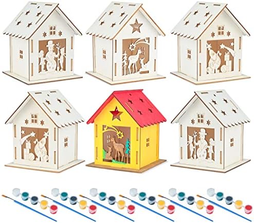 6 Wooden Christmas Houses – Christmas Crafts for Girls and Boys – Kids Bulk Arts & Crafts Set – 6 DIY Wood Kids Christmas Tree House Kit, 6 Paint Strips, 6 Paintbrushes for Children to Build & Paint
