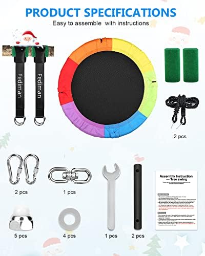 ☀️ Durable Large Tree Swing:Soft Foam Padded 40″ Steel Frame with 2X2 Anti-UV Textilene Fabric Seat to support greater Weight up to 700 pound, fits 3 kids, safer for your kids to swing whole days! ☀️ Two EVA Foam Handles for Max Security: EVA Foam Handle is safer and easier to grab for kids, when comparing with the weak rope. Their height is thoughtfully designed to be adjustable to fit your kids’ needs! ☀️Upgraded 2 X 2 Textilene Swing Seat: Made of High Quality 2 X 2 Textilene Fabric, Fediman Sturdy Swing Seat is Rip-Stop,Anti-UV, Quick-Dry and Non-Fading, Lasts Much Longer than Any Other Materials, All Weather-Proof! ☀️ FREE Swivel + 2 Buckles + 2 Straps: No More Humdrum Swing Back and Forth, with Fediman M8 1PK Swivel Spinner + 2pcs 10ft 1000D tree straps + 2pcs M8 Ring Buckles, the swing could be 360°Rotated or swung back and forth, two play ways for endless fun! ☀️ A Sturdy Full Set: Galvanized Steel Frame + 2 x 2 Textiline Fabric Seat + Upgraded Braided Ropes for higher load capacity + 3pcs M8 Stainless Steel Buckle enhances security + 1000D Tree Straps to support Spin or Swing, no need to buy more and save your money!