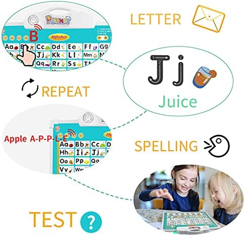 💖Innovative design:Our drawing board is different from the traditional letter learning poster. The front is a point-reading function, the back is an erasable drawing board, and it is also equipped with a reusable graffiti pen. Such a design can attract children’s curiosity and inspire children’s drawing talents. 💖 Fun educational toys: Environmentally friendly ink printing, clear patterns, standard accents, adjustable volume, suitable for children’s speaking speed. Your children can draw on this doodle board or practice what they have learned while enjoying wonderful music. 💖 Space-saving and easy to carry: Electronic Interactive alphabet can be hung on the wall, can also be used flat on the table, does not occupy any other space. You can use it at home or during travel, which helps foster parent-child relationships during the journey. 💖 Healthy and Safe:Our alphabet poster is made of environment-friendly ABS material,non-toxic, no pungent odor. The corners are smooth and do not hurt your hands.Writing tablet is waterproof, but it cannot be soaked. 💖 Rich content and games: 7 learning modes, 45 cognitive images, and a song; using the ABC learning tool, your child can explore letters, pronunciation, spelling, challenging quiz games, drawing and interesting music!
