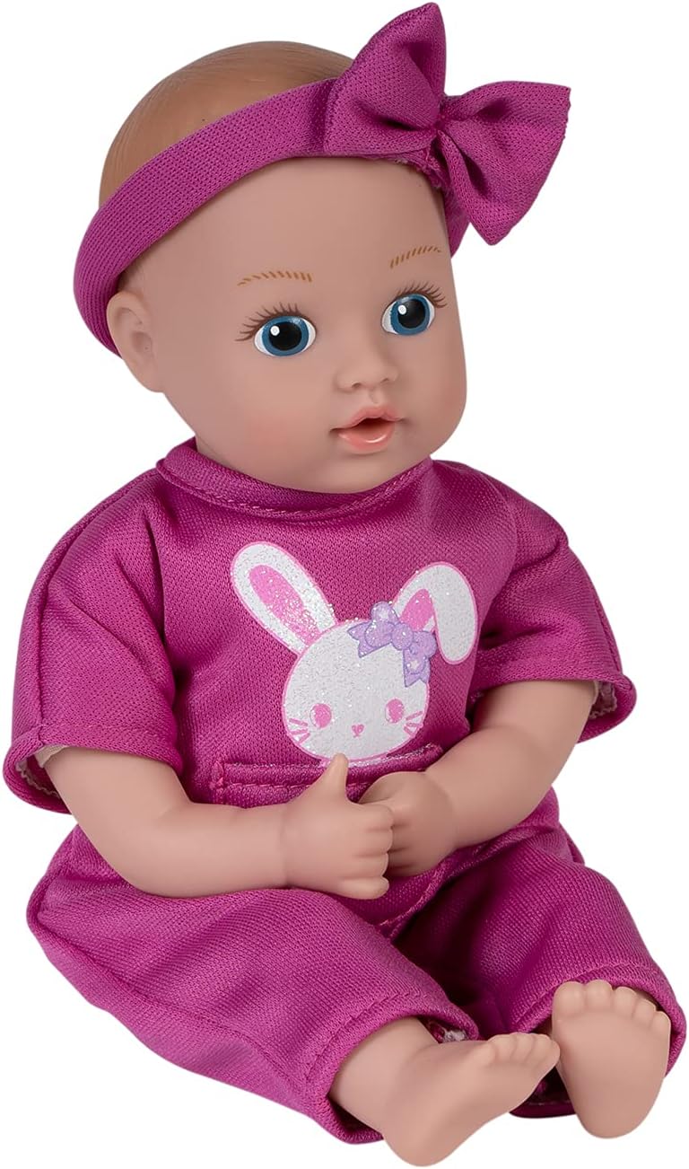 Adora Be Bright Tots & Friends Baby Bunny is an animal-themed soft baby doll with blue eyes, hand-painted details, and opened baby lips so she can suck her thumb to help her soothe. She is outfitted in a magenta jersey knit onesie with a front pocket and a graphic print of glittered bunny that resembles her Spirit Animal friend, a mini flocked toy bunny that she arrives with! She also wears a matching bow headband to accessorize her hand-painted hair. She is 100% Machine Washable, perfect for the little hands to hold and love. She also has a weighted bean bottom with cuddly soft body and vinyl limbs crafted from our premium vinyl material, making her a perfect 1st baby doll for toddlers. Made for play for ages 1 and up.
