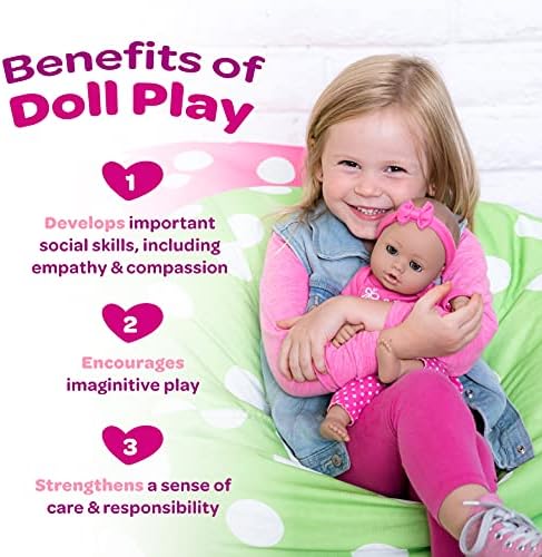 • Size: 13″” Adora Doll • Medium Skin Tone/Brown Eyes • Perfect 1st baby doll weighing about 12 oz. • Sits comfortably with weighted bean bottom • 100% Machine Washable • Fresh baby powder scent • Super cuddly, silky smooth body • Exclusive GentleTouch™ vinyl • My eyes open and close • Sweet ADORAble face • I can suck my thumb • Removable clothing • Encourages nurturing and pretend play • Includes Adora baby bottle • Ages 1 and up Adora’s PlayTime™ Babies are handmade with care and ready to be loved. Each PlayTime™ Baby is created in our exclusive GentleTouch™ vinyl which has a fresh baby powder scent. They also have a cuddly silky-smooth body that reminds us of the beloved trim on a child’s favorite baby blankie! Each PlayTime™ Baby can suck its thumb and has eyes that open and close, perfect for little ones learning to nurture and engage in pretend play. You will adore their life-like features from their cute little button nose… to their tiny little hands and feet! Their bean bag weighted bottom gives them a life-like feel, perfect for cuddles and kisses. While they are considered the perfect “1st” baby doll for toddlers weighing just about 12 ounces, this is a must-have for all “parents-in-training”! PlayTime™ Baby Pink is a perfectly pink cutie! She comes dressed in a fully pink ensemble – pink long-sleeved shirt embroidered with “”Adora”” and a butterfly, pink polka dot pants and a matching pink headband with a bow! Whether it’s hugging them tight, feeding them or putting them down for a nap, your PlayTime™ Baby is ready to be loved! The best part is that they are 100% Machine Washable, so after a trip to the playground, store or park, wash them, lay them flat to dry and they’ll be fresh and clean again! Ages 1 and up. 13 INCH SOFT BABY DOLL created in our exclusive GentleTouch vinyl, with a fresh baby powder scent and silky body ENCOURAGES NURTURING & PRETEND PLAY – comes with a baby bottle for feeding time and removable on-trend outfit HIS EYES OPEN & CLOSE and he can suck his thumb, making this baby doll a perfect nap time friend! 100% MACHINE WASHABLE, Safety Tested. BPA free. Award Winning & Made with Love Best GIFT FOR 1 YEAR OLD GIRLS Comply with USEU and other international safety regulations for age 1+