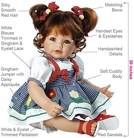 • Size: 20” Adora Doll • Fair Skin Tone/Red Hair/Blue Eyes • NEW! CuddleMe Vinyl – Cuddly soft baby powder scented vinyl • Hand-painted face • Hand applied eyelashes • Hand-sewn premium quality fashions • Weighted to feel just like a real baby • ADORAble and Realistic baby doll face • Fresh baby powder scent • Removable clothing • Ages 6 and up She will have you smiling with delight in no time! Perfect for kids and trendsetters age 6 and up, Adora ToddlerTime Daisy Delight is a realistic baby doll with a sweet face and charming expression! Oh-so ADORAble, this 20-inch baby doll is ready to steal your little one’s heart with her beautiful auburn-red hair tied up in red and white polka-dot bows with sweet daisy adornments that truly brings out the vibrancy of her pretty blue eyes. Ready for a morning of play at the park in her navy and white gingham dress adorned with multi-colored daisy appliqués, white baby bloomers, and sandals, this lifelike doll will surely be a playground sensation! Not to mention, this baby doll even wears a traditional diaper—so complete your nursery with Adora PlayDate Accessories for an even more realistic fun play! ToddlerTime Doll Daisy Delight is creatively crafted from baby powder scented high-quality vinyl with movable head, and ¾ vinyl arms and legs. Just like the rest of ToddlerTime Dolls, this doll has a weighted cloth body specifically designed for the kids to play and snuggle with! It’s time to inspire imagination and encourage creative play with Daisy Delight! Makes a great gift for ages 6 and up.” Heirloom quality, made for play: At the heart of all of your special moments, this realistic baby doll makes the perfect gift for girls and boys to pass down the generations. For age 6 years old and up. Develop your child’s social skills: Comes with weighted body, designed to feel just like a real baby in your arms, complete with diaper, moveable head and 3/4 vinyl limbs. Perfect for encouraging empathy and kindness Crafted to last: Soft baby powder scented CuddleMe vinyl, Adora’s realistic baby dolls are made to be cuddled, cherished and crafted to last. Light skin tone, auburn red hair & blue eyes Beautiful 20 inch real life baby doll with hand-painted face, hand applied eyelashes, and hand-sewn premium quality fashions perfect alternative for reborn toddlers US based company with over 20 years of making ADORAble toys. We’ve been inspiring young minds with toys, dolls and doll accessories that kids love and parents approve.