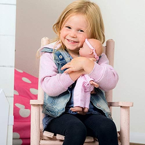 Sweet Baby Girl is the perfect petite baby doll for little ones to hold, play with and love! This cute mini baby is 11” tall with a soft and cuddly body and fresh baby powder scented vinyl. Her sweet adorable face, bright blue eyes and light blonde painted hair will have you falling in love! She comes in a removable stripped pink & white onesie and a matching pink headband with a stripped bow, perfect for little hands to develop essential motor skills. Sweet Baby Girl can suck her thumb and has movable limbs, which encourages nurture and pretend play. She also comes in an adorable pink box made to look like a crib so she has the perfect sized bed for naps and bedtime! Best of all they are 100% Machine Washable! My First Baby Doll: These Sweet babies are the perfect first baby dolls for kids and toddlers age 1 and up; light skin tone, bright blue eyes and blonde painted hair Banish germs from your child’s Playdate: All Adora Sweet Baby Dolls are 100% Machine Washable, Safety Tested & BPA free, so parents will love them too! Help develop your little one’s motor skills and inspire creative play: Created in our exclusive GentleTouch vinyl, and made for play, you’ll be inspiring your child in imaginative play, teaching kindness and empathy. This mini baby doll can suck its thumb and comes with a reusable crib box. Perfect toy for 1+ year old girls. Great gift for birthdays and holiday. US based company with over 20 years of making ADORAble toys. We’ve been inspiring young minds with toys, dolls and doll accessories that kids love and parents approve.