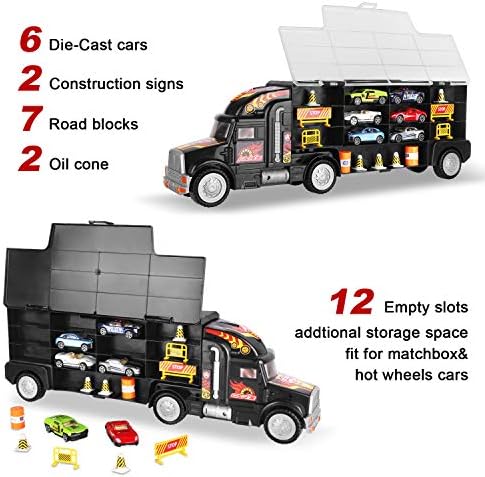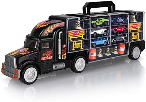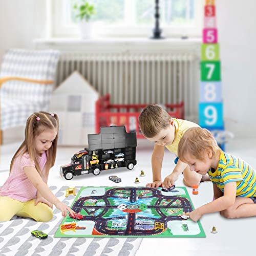 đăHIGH QUALITITY SAFE MATERIALă- Our car carrier truck toy is designed with high quality and durable materials, thant will provide long-term strength and use for years to come. Semi truck toy is made of environmentally-friendly ABS plastic, safe and non-toxic. No batteries required, just push and the toy cars will move. đăCOMPLETE HIGHWAY SETă- The toy truck set includes cool die-cast cars, construction signs, roadblock, cones, and cartoon city map. As toys car carrier vehicle, the front cab of the truck is detachable. Clear snap-close lid can display all the car and accessories inside the carrier truck toy and keep them safe inside. đăEASY TO CARRYă- This car carrier truck toy has a handle on top, making it easy for children to carry the big truck around with the colorful mini cars stored inside. Additional 12 empty slots are available to storage your Matchbox or hot wheel cars. đăEDUCATIONAL DEVELOPMENTă- These toy car carrier truck set is ideal for boys and girls that love to play construction truck games. This toy vehicle and cars set will help to develop kids’ early educational skills like thinking, imagination ability, and creativity. The city map and transportation facilities will help children learn more about our city traffic. đăPERFECT GIFTS FOR KIDSă- Perfect car toys for boys and girls ages 3-12 years old, as the best gift for Birthday, Holiday, Christmas and other special occasions. This hot wheels car set will bring them a huge surprise, they will enjoy hours of play and will never forget it.