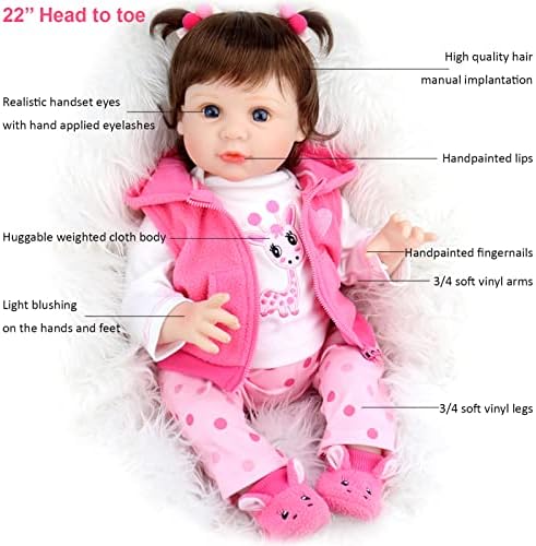 Safety Comes First -When it comes to your little one’s happiness, there’s no room for compromise. This realistic baby doll is made with premium quality, highly durable soft vinyl, a special material which is 100% safe, skin-friendly, this doll’s head and limbs comply with ASTM F963 and EN71 safety requirements,easy to clean and guaranteed to withstand the test of time! Hand-painted with Love – Prepare to be blown away by this baby doll’s realistic details. The life-like baby dolls are made with soft vinyl .The lips and the fingernails were painted by hand, while the eyelashes were manually implanted.She has a full set of hair and it is higher quality than the usual mohair.The little hands and feet have a light blushing, too. Gorgeous Life-Like Design – She is a realistic baby figure with a cute face and a huggable body .This baby doll accessories set includes a 22-inch tall ultra-realistic design ,she weights nearly 4 pounds,the weighted body adds to her lifelike characteristics.Moveable hands lets you put it in sitting and lying position with ease. The little hands and feet have a light blushing, too.She can fit in regular newborn size clothes. Desighed to Delight – Make playtime more fun and interesting with this lifelike baby doll. Would you like to make sure your toddler enjoys an interactive and educational playtime experience! This reborn baby is the perfect choice!She is a doll your child will play with for years to come. Give the Gift of Joy -Cheer up a loved one by getting them this 22-inch baby doll. She comes in a nice gift box and full set of accessories for taking care of a newborn. Package includes:Reborn doll*1,Suits of deer *1(just like the picture),Plush deer *1,Magnet pacifier *1,Bottle *1,Birth certificate*1.