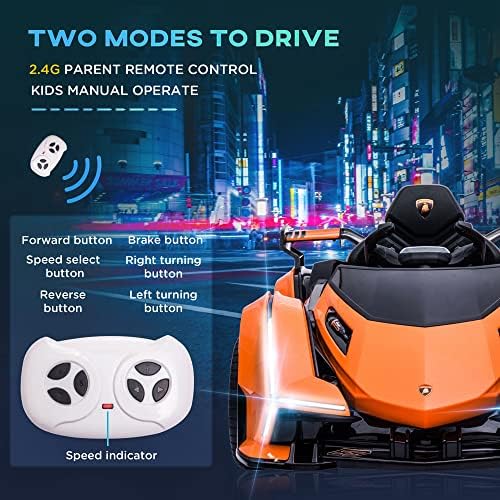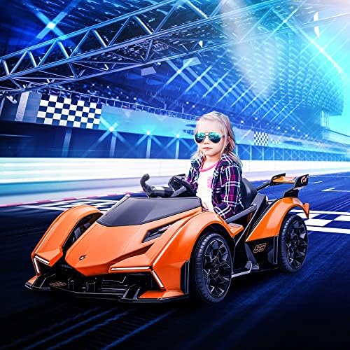 OFFICIALLY LAMBORGHINI LICENSED: Behold, your kid’s new electric ride-on car: the officially-licensed Lamborghini V12 Vision GT concept car. 12V motor for a powerful drive and 45 mins of the continuous play off a single charge of 8-12h. With LED advanced linear custom light bar, this ride-on car is truly nothing short of unforgettable. SAFE & CONVENIENT: The ride-on Lamborghini provides a smooth and comfortable ride. With extra-wide 10″ tyres, a low center of gravity, four-wheel suspension, your children are ready for any obstacle the “open road” throws at them. Both the steering wheel and the seat can be quickly removed, making it easy to carry out. CHILD DRIVEN OR REMOTE CONTROL: Your kid has (almost) total control, thanks to a two-speed setting, allowing them to drive the sports car directly, or you can take control and use the remote. The remote has forward/reverse controls, steering operations, and a 3-speed selection. Just remember to always keep an eye on your child while they are riding (even when they protest). BLUETOOTH FOR ENJOYABLE DRIVING: The steering wheel’s horn, music control buttons, and dashboard display lights help create as close to a realistic driving experience as you probably can get. Of course, what we all want is music control, right? No sweat. There are pre-installed songs, but you can also use a USB stick, a micro SD card, MP3s, or Bluetooth to rock out. LAMBO INFORMATION: Overall Dimensions: 46″ L x 26″ W x 19.75″ H. Weight Capacity: 55 lbs. Battery: 12V 7AH. Certification: SOR, ASTM F963-17, CPSIA. Suitable for ages 3-6 years old.