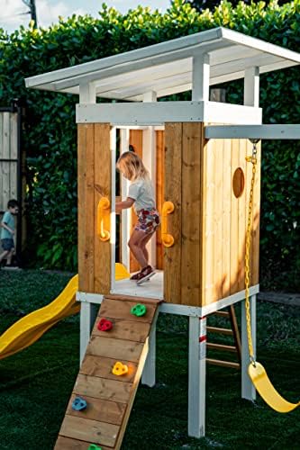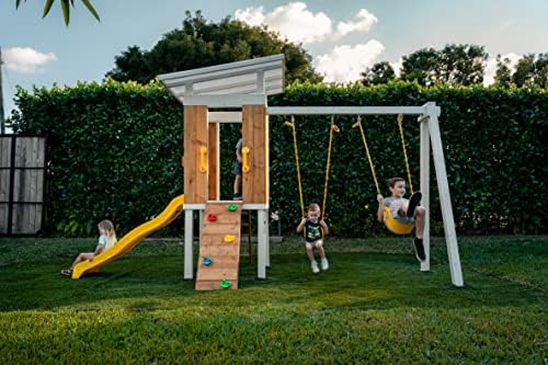 ❤️UP TO 7 CHILDREN – Maximum weight of 110 pounds per child. Encourage hours of active, engaged playtime with a variety of activities in your own backyard! Avenlur wooden swing set features swings for up 2 at one time, Playhouse, a place for a sandbox, with a swing set ladder and rock climbing wall to reach the raised, play fort and race down the slide. Everything you need to create the perfect play-safe swing set experience in a single day! ❤️HIGH QUALITY CONSTRUCTION – Made with 100% Pine wood that has been pre-cut, pre-drilled and pre-stained for ease and convenience, large enough for multiple master pieces ❤️ROCK WALL INCLUDED – Rock Climbing Wall Build strong arms while going on a Rock Climbing Adventure! ❤️UPPER PLAY – covered upper fort with built-in Window and wood enclosed walls for added protection and clear line of sight for parents ❤️6 FOOT SUPER SPEEDY WAVE SLIDE – and side rails, 2 position swing beam with heavy duty belt swings and rope chains perfect for little hands. ❤️TAKE PLAYTIME TO NEW HEIGHTS: With AVENLUR’S Versatile Outdoor Wooden Swing Playset. Combines safety, style, comfort, and fun; Great for all-year-round use ❤️PERFECT PLACE FOR CHILDREN: Expand their imagination and stay busy for hours. Designed to complement any yard; Features a swings, slide, climbing rock wall, ladder.