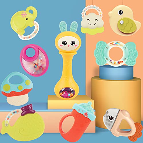 Price: (as of – Details) Product Description Dual Function Baby Rattles and Teethers 10PCS for Ages 3 Months and Older Rattles provide a source of stimulation. Babies like the sounds they make and follow the moving rattles with their eyes and try to grab and hold them, which encourage the development of fine motor skills