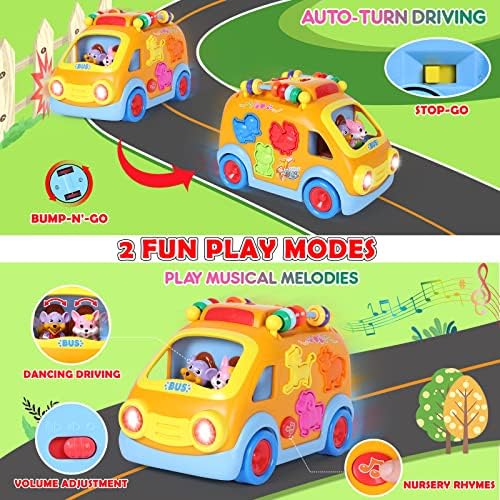 🧑【THE BEST EARLY EDUCATIONAL TOY】Educational toys for 1 2 3 year old, 3D animal blocks and colorful beads help your baby identify various colors and animal shapes. By turning the key, you can open the rear of the car and free the little animals to practice your counting skills and hands on ability, give your baby a comprehensive range of learning and thought development. 🏆【MAGICAL MELODY&ANIMAL SOUNDS】This car toys for toddlers 1-3 will play a variety of songs, teaching baby rhythm and dancing with music. Put the animal blocks in holes and the bus will play animal sounds. Develop young children’s animal recognition skills through shapes and sounds. The volume button lets you switch off the music and stop the noise. A helpful function to protect baby’s hearing. 🚌【2 FUN PLAY MODES】Turn on “Go” and the toy cars for 1-3 age will driving, the lights flicker and drivers dancing with music, encourage baby to chase & crawl. Turn on “Stop” it becomes a cute baby toy, tap the music button, play 9 nursery rhymes with lights. Perfect for baby to develop motor skills and learn how to control muscles which enable walking, running and body balance when playing. 💡【SAFE&THOUGHTFUL DESIGN】The baby boy toys is made of non-toxic ABS, polished smooth edges, burr-free and contains no small parts to avoid choking hazard. Start the toy bus, it will get a real car start sound. Equipped with universal wheels, the toddler toy can self-avoids obstacles, which guide babies in a safe direction and develop spatial awareness. Good choice as infant baby toddler boy girl toys age 1-3 year old. 🎁【AWESOME GIFT FOR BABY】Baby toys for 18 months up, it is perfectly sized for baby’s little hands to train baby’s grasp ability, portable outside toys for toddlers 1-3. Perfect as Birthday Gifts, Christmas Gifts, Chriden’s Day Gifts, Halloween Gifts, New Year Gifts, Thanksgiving Day Gifts, Valentine Gifts, Easter Gifts and Party Favors!