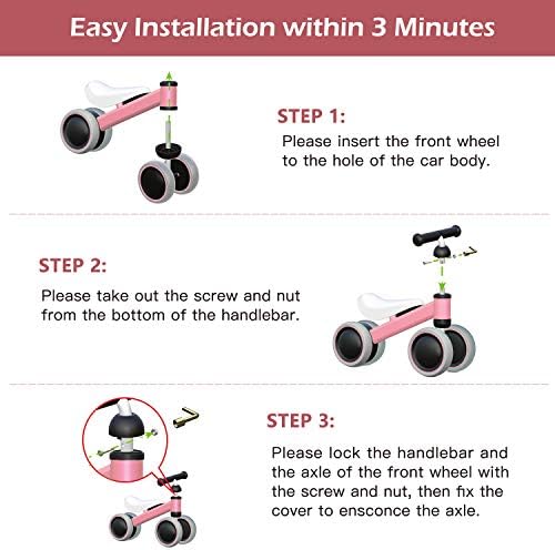 😊 Recommended Age: The baby balance bike Suits 9-24 month infant,27.5 – 33.5inch kids in average height, Max. load capacity up to 44 lbs 😊 Safety Design: 135° limit steering design to avoid side falling,fully&widen enclosed EVA wheels ensure baby feet safety, BPA-Free material, authoritative safety certification for ASTM F963-11 , EN71 😊 Special Features: Anti-slip & Noiseless Wheels, comfortable leather seat pad,sturdy carbon steel construction, lightweight balance bike for carrying indoor and outdoor 😊 Easy to Assemble: Developed modular design,the baby walker is assembled within 3 minutes, no tool required 😊 First Birthday Gift: Toddler bike helps to develop babies’ balance, enjoy riding,build confidence, independence and coordination. Well packed in gift Box, best gift for first birthday, Children’s Day, Christmas