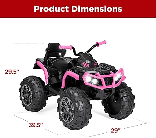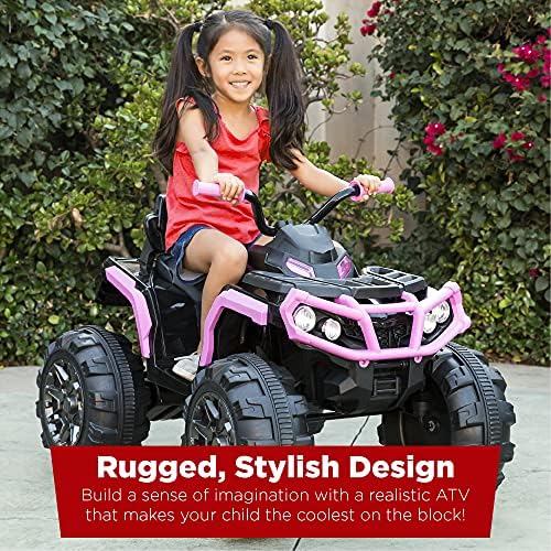 RUGGED, STYLISH DESIGN: This ride-on ATV is built tough and equipped with realistic features to build your child’s sense of imagination and adventure LARGE, TREADED WHEELS: With 4-wheel suspension, it can conquer grass, dirt, driveways, and sidewalks, while LED headlights and a horn create a fun and realistic ATV experience! BLUETOOTH CONNECTION: A Bluetooth function allows kids to wirelessly connect media devices so they can drive while jamming to their own selection of music REALISTIC FUNCTIONALITY: Drives like the real thing, with a foot pedal accelerator, forward/reverse function, and 2 speed selections (high & low) with a thrilling 3.7 mph max speed RECHARGEABLE BATTERY: Remove the long-lasting 12V battery (1.5 hours run time per charge) and connect it to the included charger to rev it back up for another ride session!; OVERALL DIMENSIONS: 39.5″(L) x 26″(W) x 29.5″(H); WEIGHT CAPACITY: 66 lbs.