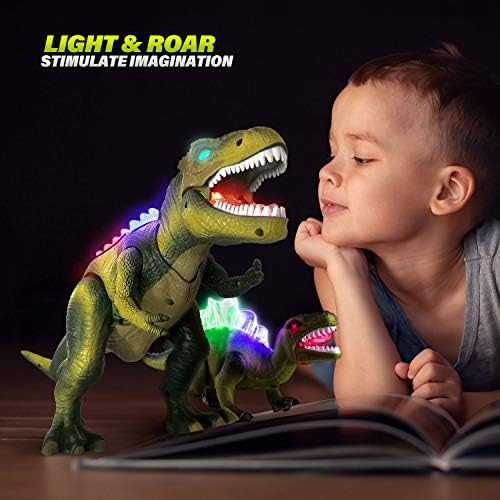 Valuable Dinosaurs Pack: The whole package includes a remote controllable dinosaur, a walking dinosaur(which can not be remote controlled) and a bag of 9 dinosaur figures. Kids can have fun with them for the whole day without any pause. Fun Remote Control Dinosaur: The dinosaur remote controllable dinosaur can walk, dance, fight and shake head, which brings more fun than other dinosaur toys. Under fight mode, the dinosaur will enter attack mode. The smaller dinosaur can work as the attack target to simulate a real fight! Educational Toy with Vivid Lights and Roar Sounds: The dinosaur can light and roar. Satisfy children’s curiosity and stimulate their imagination. In the process of playing, enhance their hand-eye coordination, hands-on ability, and stimulate learning ability. 9 Dinosaur Figures: Have a Jurassic Adventure Tour! The bonus small dinosaur figures included are waiting for your toddlers’ exploration, including Tyrannosaurus, Pterosaur, Stegosaurus, Pterodactyl, Spinosaurus, Tyrannosaurus, Velociraptor and Ox dragon. Both boys and girls love the mystery and power of dinosaurs. Perfect Gift with Safe Material: The dinosaurs are made of non-toxic and sturdy ABS plastic. Great holiday/birthday/Christmas gift for your son or daughter. It is also a great party decoration, which is popular among toddlers.
