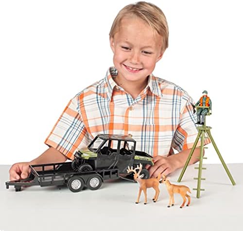 Our NEW Polaris Ranger includes a Polaris Ranger, ATV trailer, hunter, rifle, deer stand, and buck and doe. The Polaris Ranger features a working dump bed, tailgate, and winch. The ATV trailer features a tailgate, trailer jack, and peg hitch to connect to the Big Country Toys Ford F250 Super Duty truck. The hunter can drive his Polaris Ranger to his stand, make the climb up, and sit on his chair as he waits for the deer. After he is done for the day, he can load up his Ranger onto his trailer and head home! The 8-Piece Hunting Set is the perfect gift for kids that love to hunt! COLLECTIBLE: The Polaris Ranger fits with Big Country Toys NEW line of 1:20 scale fishing toys, and existing line of 1:20 scale farm, rodeo, and fishing toys. PLAYABLE: The Polaris Ranger features a working dump bed, tailgate, and winch. The ATV trailer features a tailgate, trailer jack, and peg hitch to connect to the Big Country Toys Ford F250 Super Duty truck. The hunter can drive his Polaris Ranger to his stand, make the climb up, and sit on his chair as he waits for the deer. After he is done for the day, he can load up his Ranger onto his trailer and head home (truck sold separately). MEASUREMENTS (L x W x H)(Inches): Polaris Ranger: 7.5″ x 3.25″ x 4″, ATV Trailer:10.5″ x 5″ x 3″, Hunter:.75″ x 1.5″ x 3.5″, Rifle:2.5″ x .5″ x .5″ Deer Stand (legs extended):5″ x 5″ x 7.75″, Buck:3″ x 1.25″ x 3.75″, Doe: 2.75″ x 1″ x 2.75″ BIG COUNTRY TOYS: We design, manufacture, and market a growing line of 1:20 scale farm, rodeo, and adventure toys, farm and rodeo bouncy toys, and biblical based children’s books.