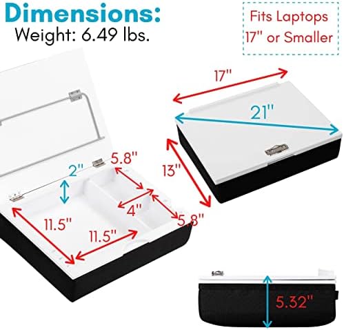 BIRDROCK HOME Lap Desk with Laptop Storage is equipped with a storage compartment under the lap desktop. Simply lift the lap desk and store your iPad, phone, and other computer and office accessories within the storage space. With a frame and top crafted from MDF wood and a cushioned bottom, this laptop lap desk provides a stylish and elegant touch to your home, office, or hotel. Built with sturdy and durable construction, feel safe using your laptop, iPad, tablet, books, drawing canvas, snacks, food, and more on the lap desk. STURDY LAP DESK: With a frame and top crafted from MDF wood and cushioned bottom, this laptop lap desk provides a stylish and elegant touch to your home, office or hotel. Built with a sturdy and durable construction, feel safe using your laptop, iPad, tablet, books, drawing canvas, snacks, food and more on the lap desk WEIGHT: 6.49 lbs. WORK FROM HOME: the perfect portable desk so you can get work done sitting anywhere in your home. Great for working from your bed, couch, chair or patio furniture. The memory foam cushion allows you to sit comfortably for long periods so you can get work done DIMENSIONS: 13 Width x 17” Length x 5.3” Height; Interior Dimensions: 11” Width x 15” Length x 2” Height