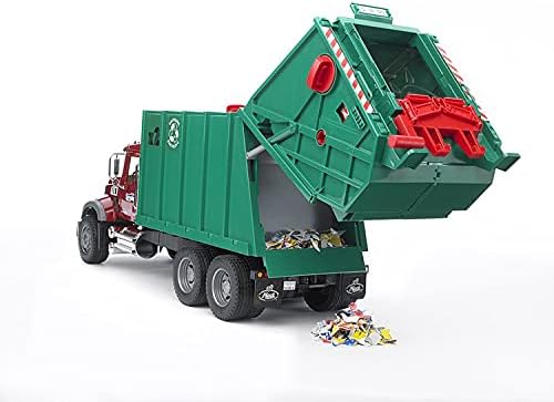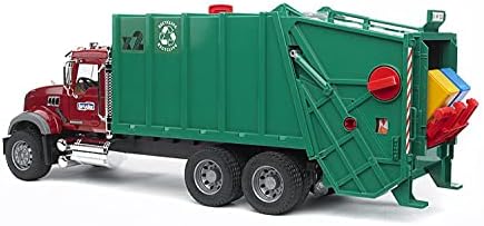 Price: (as of – Details) MACK Granite Garbage truck (ruby red-green) Engine hood opens to reveal engine doors open mirrors fold out Tilting refuse container can be opened Real working press Tires have real tread 90% plastic,10%rubberMade in Germany; Made of highest quality ABS plastic in scale 1: 16Includes MACK Garbage truck and 2 trash