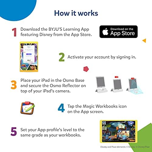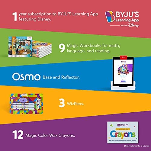 LEARNING FIRST WITH BYJU’S: A trusted education brand helping students learn, over 70 million, across the globe – now available in the US. Build fundamental skills aligned to grade level learning. Created by educators and Disney storytellers by blending digital and physical learning. Compatible with iPad devices, device not included. SEE. PLAY. DO. LEARN. A guided adventure combining the magic of Disney storytelling with interactive learning activities. Adapts to your child’s learning level and provides real time feedback every step of the way. It’s never been more fun to build fundamental math, language, and reading skills as your child learns alongside Disney characters. Trusted by millions of families around the globe. Compatible with iPad devices, device not included. Internet required to play. 1,000 + LEARNING ADVENTURES: Concepts are made simple and fun through video lessons, read-along stories, and interactive quizzes. Plus, digitally – enabled worksheets with real-time feedback motivate children to practice what they learn. Powered by Osmo, and featuring children’s favorite Disney characters such as Elsa, Woody, Moana and more, this standards-aligned program provides a whole new way to play and learn! HELP BUILD SKILLS ALONGSIDE DISNEY CHARACTERS: Designed by educators, our active learning approach helps kids master foundational concepts, develop problem-solving skills, and practice critical thinking. Grade-specific skills include identifying and recognizing numbers, letters, and words. Personalized so your child can progress at just the right pace. BUILDS SKILLS NEEDED IN SCHOOL: Grade-specific kits and digital content that adapts to your child’s learning level help develop vocabulary, number sense, spatial awareness, reading comprehension, and more. Guided lessons support independent play. Parents can track their child’s progress & receive strategies to support their learning. WHAT’S IN THE BOX: 9 PreK Magic Workbooks (Subjects: Math, Language, & Reading), Osmo iPad Base + Reflector, 3 Wizpens, 12 Crayons, & Quickstart Guide. Plus, includes 1 year subscription to BYJU’S Learning App featuring Disney. COMPATIBILITY: iPad Only. (5th/6th/7th/8th generation iPads, iPads Mini 4th/5th generation, iPad Air 2/3, iPad Pro 9.7 and 10.5 inch). The minimum iOS version needed is iOS 13. Internet required. Due to app restrictions, the BYJU’S app will only work in the USA and Canada.