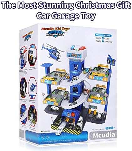 【 Mcudia Luxury 5 Level of Parking Lot with 24 Parking Spaces 】 After driving the car to the first level for car washing/repairing or adding 98# gasoline, drive car toy into the parking lifts, and press the big red switch to pull up the car to 2 / 3 / 4 / 5 level parking space, the big blue button is down. For the City Police Department to catch race cars quickly, a helicopter is prepared on the top floor. And the speed of the police car is faster than the race cars when sliding down the track. 【 Easy to Install & Stronger Sticky Stickers 】 The Mcudia car garage city has paper manuals/videos and detailed assembly blogs. You can choose any way you like to assemble the race car garage toy. In order to make the sticker stick to the kids car track toy firmly, we have enhanced the viscosity of the sticker. Even next Christmas, it can still be used as a vehicles car display stand for children’s bedrooms. 【 Simulate Real Car Sounds & Police Car Lights 】 On the top of the elevator (or lift), there are 2 big buttons and 4 small square buttons. The 2 big buttons control the up and down of the elevator. Pressing the button will flash like a police car light. Among the 4 small buttons, blue button is the sound of the race car from starting, accelerating, and then braking, green button is the sound of the car reversing, red button is the sound of the horn, and yellow button is a small tune song. 【 Suitable for Storing the 1:64 Toy Racing Cars 】 This toy car ramp garage designed specifically for toy vehicles car collectors, and compatible with a variety of toy model racing cars. It is especially suitable for storing 1:64 model vehicles cars, and the car can be driven in the elevator or rush down from the toy car ramp. 【 The Most Highlight Gift Under The Christmas Tree 】 To assemble the take apart car garage toy set and wrap it up to become a big gift box which can basically take up the entire area under the Christmas tree. When children see the 25.2 * 19.3 * 21.2 inches gift box, they will look forward to opening it. Or to take it as the best birthday gift for your little boys or girls, it will be more attractive than a birthday cake.
