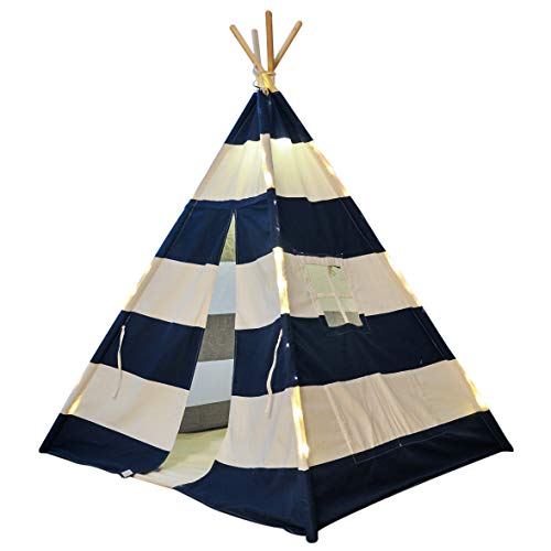 A Mustard Seed Toys Kids Teepee Tent – Portable Canvas Tents, No Extra Chemicals, Includes Carrying Case (Navy w Lights)