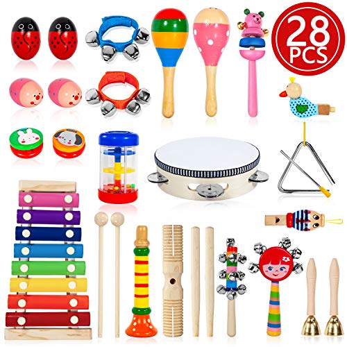 TAIMASI Kids Musical Instruments, 28PCS 18 Types Wooden Percussion Instruments Tambourine Xylophone Toys for Kids Children, Preschool Education Early Learning Musical Toy for Boys and Girls
