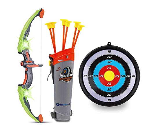 GoBroBrand Bow Arrow Set Kids -Green Light Up Archery Toy Set -Includes 6 Suction Cup Arrows, Target & Quiver Boys & Girls Ages 3 -12 Years Old