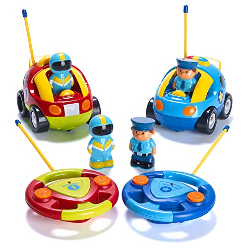 Prextex Pack of 2 Cartoon R/C Police Car and Race Car Radio Control Toys for Kids- Each with Different Frequencies So Both Can Race Together