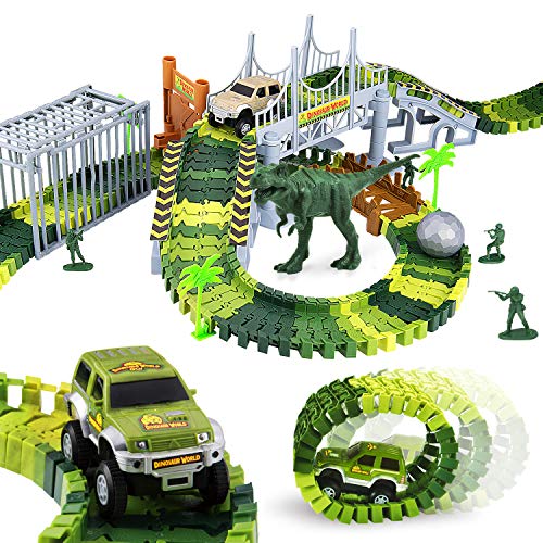 Dinosaur Toys,156pcs Create A Dinosaur World Road Race,Flexible Track Playset and 2 pcs Cool Dinosaur car for 3 4 5 6 Year & Up Old boy Girls Best Gift