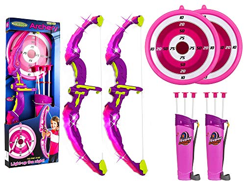 2 Pack Archery Bow and Arrow for Kids Set with LED Flashing Lights, Pink Light Up Function, Arrow Holder Target and Quiver Hunting Series for Boys and Girls Indoor and Outdoor Toys