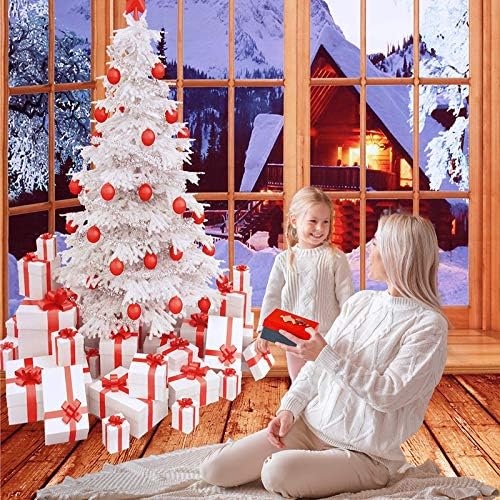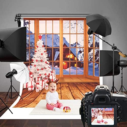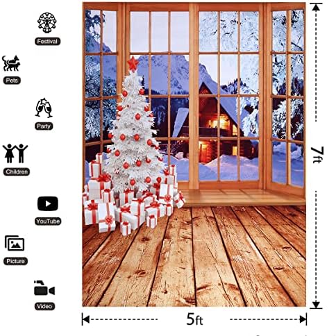 Christmas Backdrop Photo 5x7ft MOHOO Christmas Window Backdrop with Wooden Floor Christmas Tree Snow-Covered House & Mountains Photography Background for Kids, Family Photos
