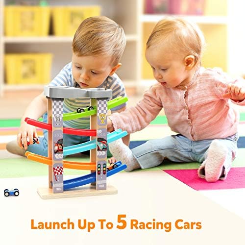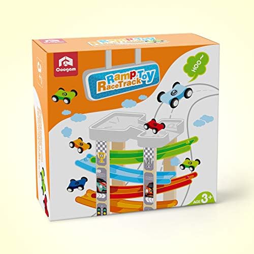 Toddler Ramp Race Track Toy:Measure 11.8”x4″x12.6″, weigh 2 pounds. The car racing game including 4 x bright colored Car Ramps, 1 x Toy Parking Lot on the top of the ramp, 5 x Wooden bright color race cars, comfortable for toddlers hands. Bright Ramp Racer Set: 5 bright mini cars set off from the top starting point and then slides down the 4 continuous rainbow race tracks. All the kids are mesmerized watching the cars crisscross down the ramps! These race cars can be stored in the “Parking” when not in use. Ramp Race Track Toy: Made of high quality wood, BPA Free and stained with bright non-toxic water-based paint, sanded smooth. No worry about wheels falling off or pieces coming apart. Car Ramp Race Track Toy:Little assembly is required, The only piece need to be attached is the removable top parking lot , other no assemble needed. This toddler race track toy is compact and sturdy, can be easily stored on shelving or in small room. Best Gift For Toddlers Kids: This Wooden Race Track toy provides the development of your child’s motor skills, spatial skills, hand-eye coordination, and attention span. Great for parties and indoor/outdoor activities!