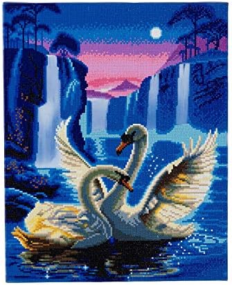 Crystal Art Light-Up LED Moonlight Swans Waterfalls Pre-Framed D.I.Y. Round 5D Diamond Painting Craft Kit On Stretched Canvas Wood Frame, Large 40×50 cm (16×20 in.)