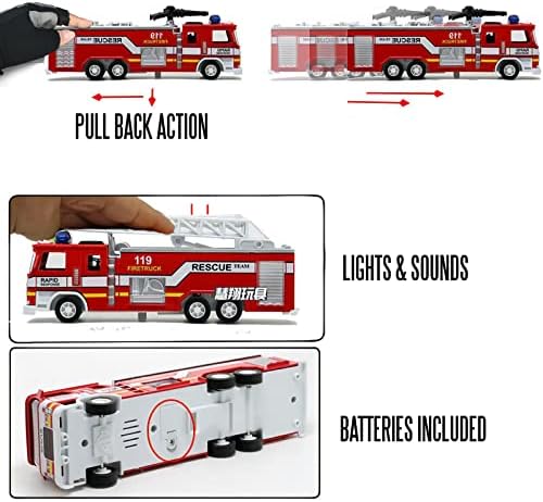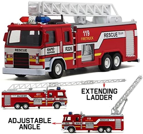 Diecast Fire Truck Engine Emergency Rescue Pullback Action Alloy Toy Vehicle with Light and Sounds (Extendable Ladder)