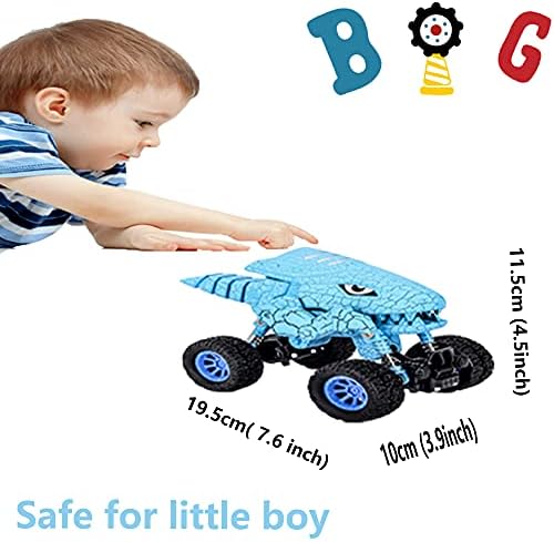 Cool looking monster truck toys for boys.Bright blue ,dinosaur figure shape,four big foot wheels, these would promote your kid’s sensory ability , imaginations and motor skills. big size monster trucks,4.53 x 3.94 x 7.68 inches,none small parts ,non-removable,totally safe as 2 year old toys for boys,and attractive dinosaur toys for kids 3-5 Fast running dinosaur toy truck. ,no battery ,big foot wheels double, power offer strong driving force to support speedy running,what more interesting is that tail down mouth open ,it inspire kids fantasy,endless fun to inspire imagination.Amazing dinosaur toys for 2 year old boy. Pretty 3 year old boy toys ,4 year old boy toys,5 year old boy toys. Durable toddler car toys :rugged tire and shock absorber gives stable running ,anti-fall and anti-skid.The material is hard and sturdy .It would last long and perfect as toys for 3 year old boys and up. 2 3 4 5 year old boy gift for Christmas/ Birthday:dinosaur and monster truck are both hot , very popular in little boys.and it’s easy to play , evenfor 2 year old boy ,great Interactive and entertaining toys for 5 year old boys Safe toys for kids:good quality dinosaur monster trucks . .All materials of this dinosaur toy trucks reach quality demand of ASTM and CPSIA .Great toddler boy toys