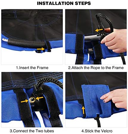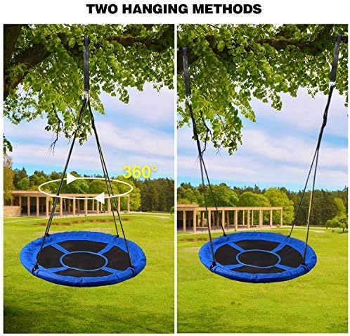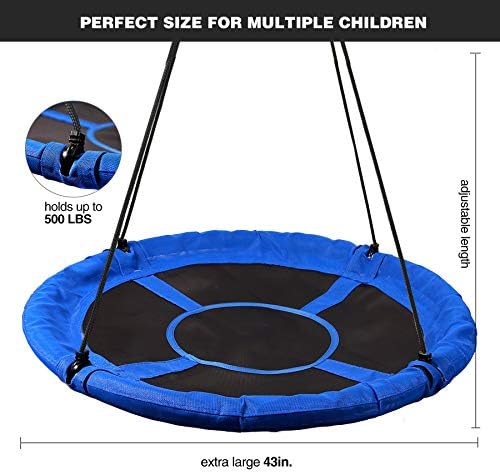 -ULTRA SAFE & BUILT TO LAST: Saucer swing for kids toddler children with a load rating of 500lbs.We take safety seriously and that’s why we only use the strongest and most safe materials around like 900D oxford fabric and strong ropes to keep safety. -ADJUSTABLE LENGTH OF ROPES: Rope can be adjustable from 47-71 inch.You can use it in many places.Like your backyard or park ,Hanging it on a tree,attach it to swing frame,jungle gym, yoga hook on the ceiling or other equipment. -CHILDREN’S FUN: Kids can push the saucer swing swing around.And you don’t need to worry as we have 4 strong ropes.This swing has 43 inch large size seat,so it’s big enough to accommodate 2 even 3 kids play on it. -EASY INSTALLATION:The saucer swing set is easy to install by the instructions,it’s convenient and time-saving effort.You can attach it to swing frame or tree by the straps,Which is avaible in package. -FRIENDLY REMINDER:This backyard swing is designed for kid around 3 years old.And don’t play it without parents or other adults supervisor.