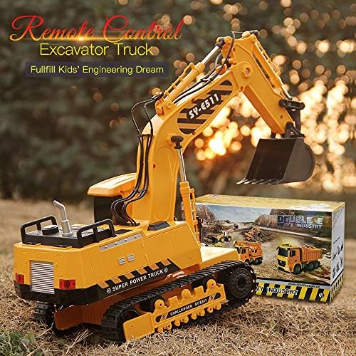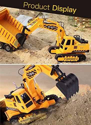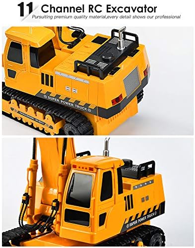 { Detailed and realistic } DOUBLE E professional heavy duty excavator toy is the most realistic replica of a construction excavator. Built on a 1: 20 scale, powerful motors and heavy rubber track tires to achieve all playing functions. { 3 separate motors } DOUBLE E 11 channels construction truck can dig in any direction as 3 powerful separate motors on its digging arm. Cab turns in a 660 degree rotation, unlimited direction, works exactly as a real excavator equip. { Superior control experience } DOUBLE E construction toy is equipped with a powerful 2.4GHz transmitter which enables you to operate at a distance more than 100 feet. It can also support multiple vehicles to play together without interference. { A Collective high quality materials } the RC excavator tractor not only looks like a real excavator, but it is also as durable as a real excavator. The construction vehicle toy is made of premium ABS plastic which is totally safe for kids&adults. { READY TO RUN } DOUBLE E excavator comes with a exquisite package box, the best choice as Birthday&Christmas gift. Includes an excavator, 2.4Ghz transmitter, 4.8v 800mAh rechargeable battery, USB charging cable. Just get ready to have fun with it!