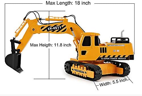 With 1:20 scale of measurements with maximum extension: 18.5*12*5.5inches .This DOUBLE E RC excavator construction toy comes with all the realistic functions just like a real caterpillar construction vehicle.