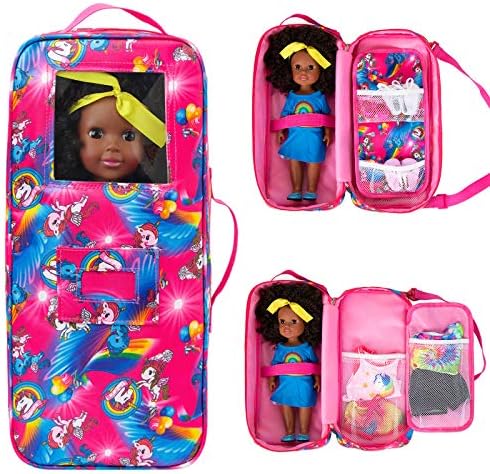 Package Includes: 1 pcs 14.5 inch black doll and doll carrier / doll travel suitcase. Perfect size for 3-12 years old kids. Realistic black girl doll: Realistic African simulated cute curly hair and black soft skin, good touch and cute face. Looks truly realistic. The head and limbs can rotate and can sit and lie down. The clothes and shoes are removable and washable, you can buy other clothes to dress her. Cute design: unique cute painting design in the suitcase, the size is large enough (15.9×7.1×5.9 inch ) that can hold the doll and clothes and other accessories perfectly. Doll travel case also can protect the doll from getting dirty or unexpected damage on a trip. An ideal gift for your children, your friends and yourself. Perfect as a Xmas gift, Birthday gift, New Year gift, party favor and other holiday gift. Kids’ laugh and happiness are our passion to move ahead! Note: We concerned your purchase experience and dedicated to your complete satisfaction.If you have any question and advice, please click your order page or go to our store homepage, click “Ask a question” to contact us.