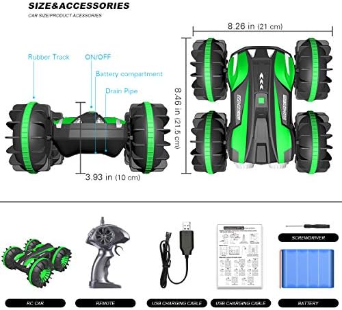 360 Degree Spins and Flips- This is a multi-functional stunt rc car, unique design let it easy to complete 360 degree spins around, best gift for boy and girls. Waterproof Design- Equipped with waterproof rubber ring to protect inner accessory of the car which makes it possible to even drive on the water, amazing fun land & water rc toys. Double Sides Running- just bump it against a wall or stop quickly to cause it to flip over, provide you the amazing visually experience. Responsive transmitter enables more than 60 meters remote control range. 2.4Ghz Remote Technology- Adopts 2.4GHz anti-interference control frequency, which enable multiple rc boat to racing together at the same time. Powerful motor enable speed up to 16.24MPH. Long Playing Time- Package comes with 6V/400mAh LI-PO rechargeable battery for car, 2 hours charging time will power the car racing for more than 20 mins.