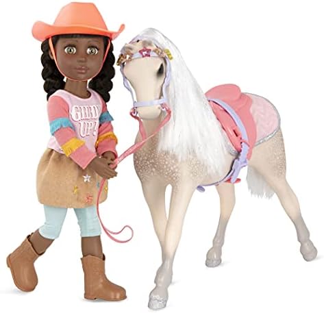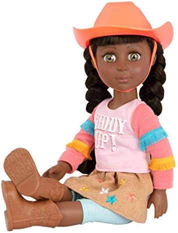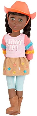 Meet Jolie at the stables! This 14-inch Glitter Girls doll loves joining show jumping competitions and rounding up her horse pals for galloping adventures! Jolie has bright green eyes, long eyelashes, and long, silky brown hair styled in two braided pigtails. But you can style her hair in a lot of different ways! She is a poseable doll who can bend and rotate her arms and legs to gallop on equestrian adventures when it’s time to saddle up! Glitter Girls dolls each come with one complete outfit. Jolie is wearing a “Giddy Up!” top with fun fringe details on the sleeves, a skirt with decorative stars, a pair of light-blue leggings, riding boots, and a stylish cowgirl hat (for an extra touch of glitz!). Her outfit also has easy-open closures to quickly put on and remove, so Jolie can explore the countryside in many colorful fashion looks! Saddle up for adventure: discover sparkly trails and explore the countryside with Jolie! 14-inch equestrian doll: Jolie has bright green eyes, long eyelashes, and long, silky brown hair that’s fun to brush and style! Poseable: arms and legs bend and rotate to sit on Glitter Girls horses and easily change into dazzling outfits! Colorful fashion: wears a “Giddy Up!” sweater with fun fringe details, a skirt with decorative stars, light-blue leggings, tall riding boots, and a matching cowgirl hat. Mix & match: outfit has easy-open closures to quickly put on and remove; compatible with most 14-inch dolls, outfits, and accessories. Recommended age: suggested for kids ages 3+ (small parts); perfect height for small hands, easy to clean, and durable for everyday play.
