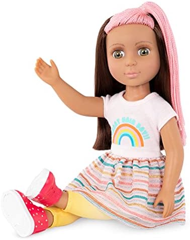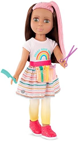 It’s time to shine with the Glitter Girls! These unique, posable 14-inch dolls have an exciting range of sparkly mix-and-match outfits and beautiful silky hair that’s easy to brush and style. Their 14-inch (36.8cm) height makes them perfectly portable and an easy size to play with for small hands. Glitter Girls dolls are easy to clean and care for, making them a great gift for 3-year-old girls (and up) who love fashion and, of course, glitter! (Contains small parts, so please supervise younger children!) Available in a range of hair, eye, and skin colors, Glitter Girls encourage children to be themselves, be positive, and “Add dazzle to every day!” all while reducing screen time and developing healthy social skills. Create a sparkling world of friendship and adventure with a range of imaginative accessories, toy horses, and 14-inch doll clothes. Let your kids “Stand Out and Be Bright” with the Glitter Girls! Salon day adventures: explore the brightest & stylish hairstyles with Lara! 14-inch hairdresser doll: Lara has beautiful hazel eyes, long eyelashes, and long, silky, brown and pink hair that’s fun to brush and style! Poseable: arms and legs bend and rotate to easily change outfits and style hair during salon days! Styling accessories: features a pretend blow dryer, 4 hair clips, a pair of scissors, comb, spray bottle, and a stylist apron to neatly hold her styling tools. Colorful fashion: wears a rainbow top with matching skirt, gradient leggings, and bright red shoes. Mix & match: outfit has easy-open closures to quickly put on and remove; compatible with most 14-inch dolls and accessories. Recommended age: suggested for kids ages 3+ (small parts); perfect height for small hands, easy to clean, and durable for everyday play.