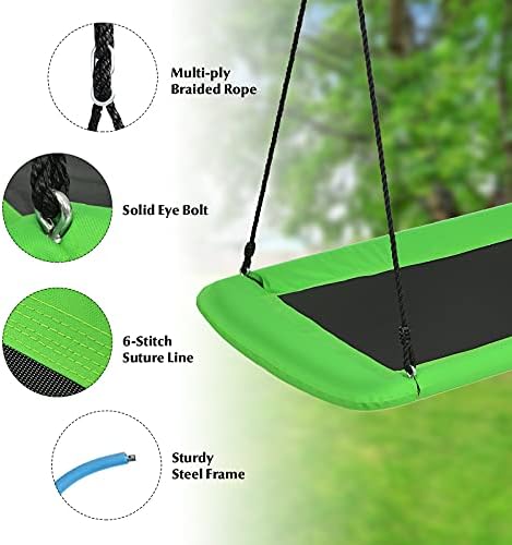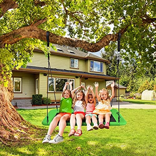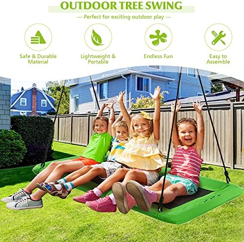Package includes: 1 × Tree Swing 2 x Hanging Straps 2 x Hanging Ropes 1 x Wrench 1 x Swivel 2 x Carabiners 1 × User Guide 🎁【Fun for the Whole Family】 Our giant tree swing provides endless fun for both children and adults, which can be attached to a swing set or tree with hanging straps. As several children can swing at the same time, their parents can relax and play together with our outdoor swings. 🎁【Strong 700LBS Weight Capacity】 Made of heavy-duty galvanized pipe, PP jump mat and premium oxford cloth, this tree swing can withstand up to 700lbs for multiple children to use. In order to make it safer for child to swing for a long time, it also comes with multi-ply ropes and reinforced seat stitching. 🎁【Flexible Height Adjustment】 Our swing is designed to satisfy your different needs. Through the extra hanging ropes, you can easily adjust the seat height within the range of 40”- 71”. Coupled with metal rings for secured fastening, it allows you to choose appropriate length to relax. 🎁【An Ideal Gift for Kids】 This multi-functional tree swing provides a fun way to sleep, read, sit for your kids. It is suitable for backyard, porch, or garden to create a pleasant entertainment place. As a perfect choice for various outdoor activities, your kids can share happy time with friends together. 🎁【Simple Assembly & Maintenance Steps】 Under the guidance of instruction, this swing can be set up without hassle. Besides, lightweight design and compact size make it easy to store and occupies less space. Besides, you can just occasionally wipe the tree swing with damp cloth to keep it clean.